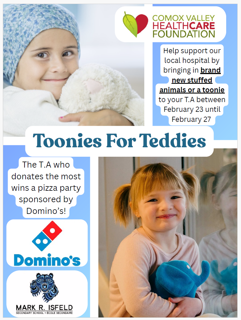 Sienna Stevens, Mark R. Isfeld Senior Secondary School student, is planning Toonies For Teddies February 23 - 27, 2026 with the hopes to grow support for the Comox Valley Hospital’s Stuffed Animal Program for pediatric patients.